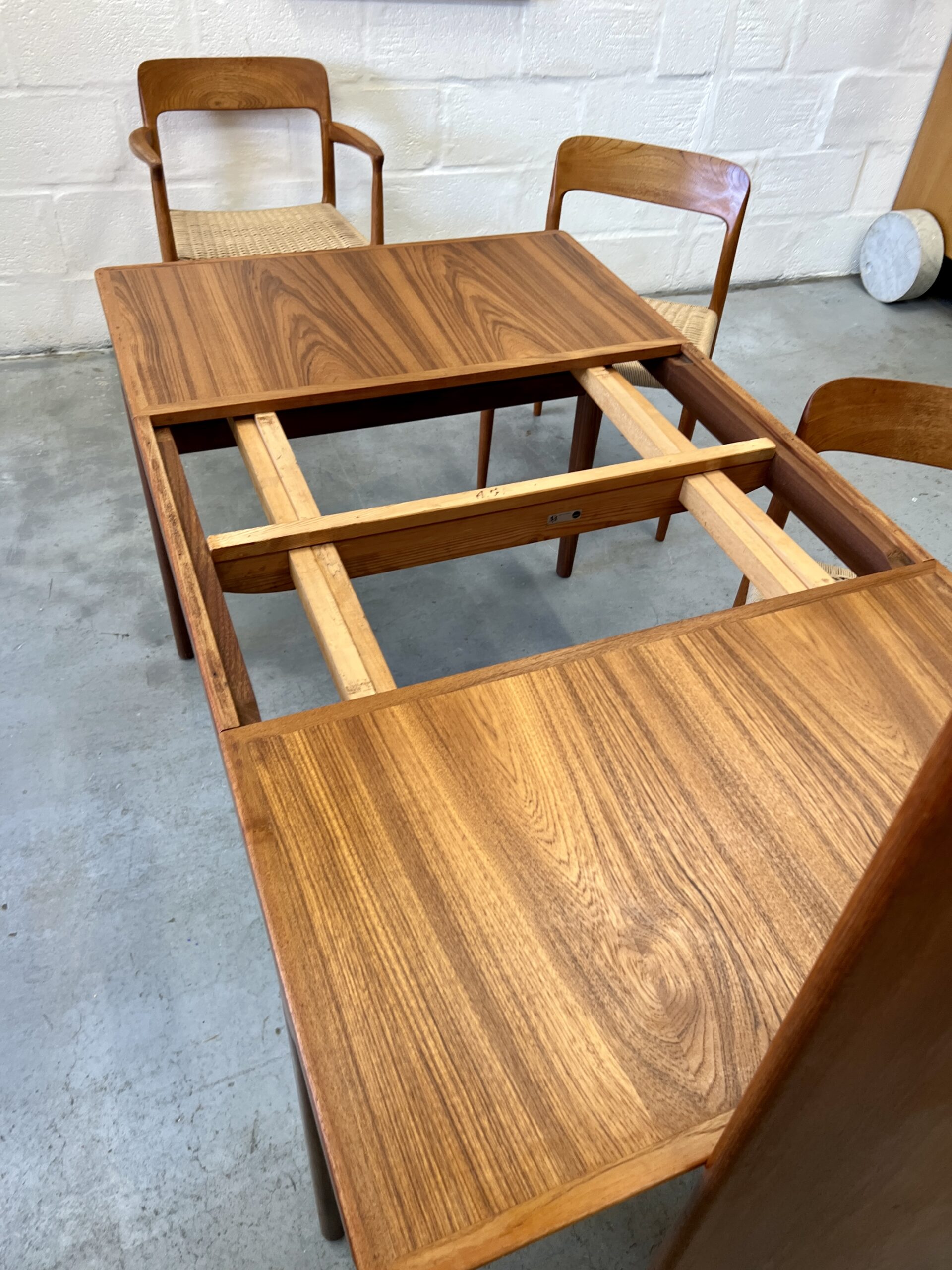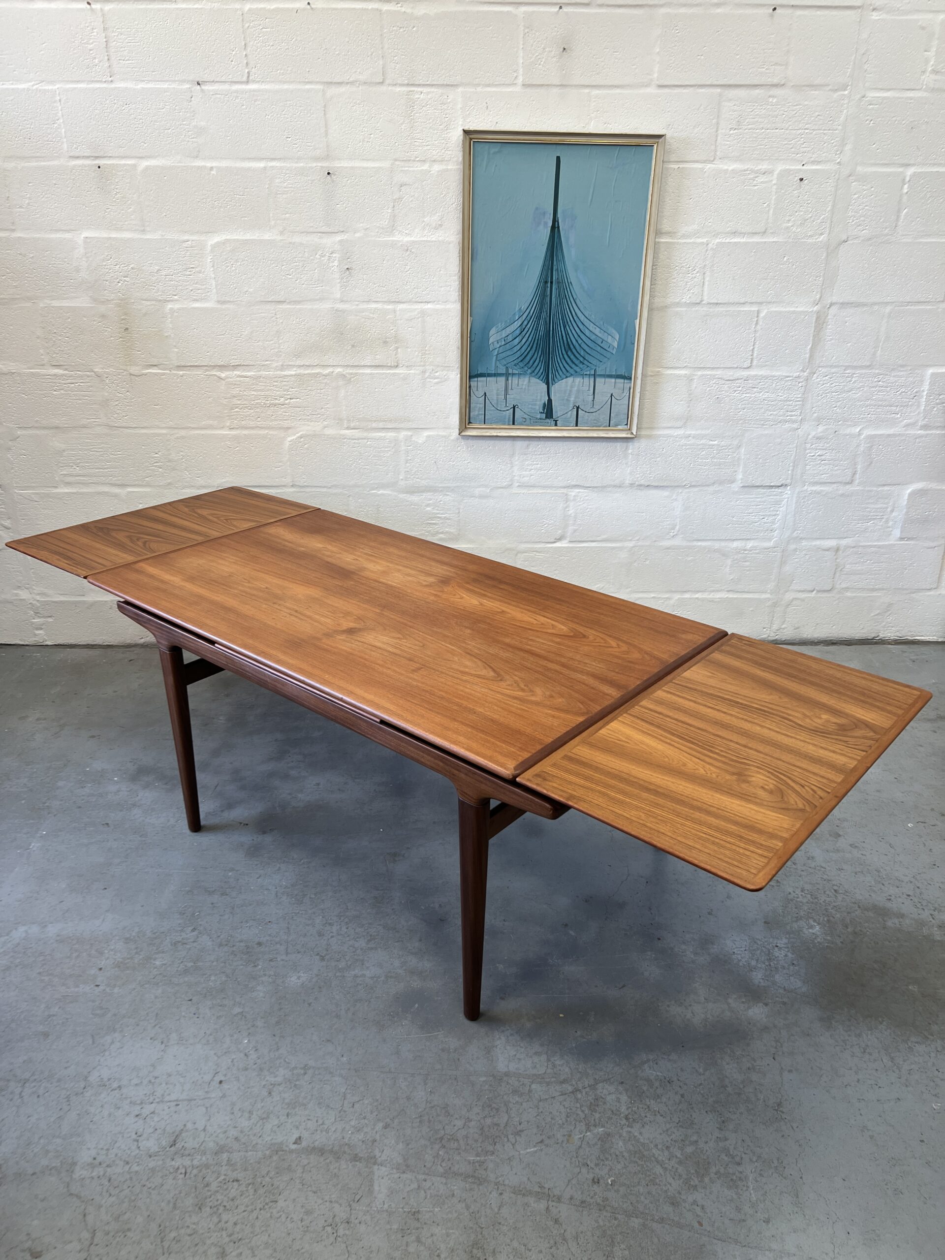 Mid century Danish design dining table in teak with 2 pull out leaves and solid teak tapering legs designed by Johannes Andersen and produced by Uldum Møbelfabrik in 1965.