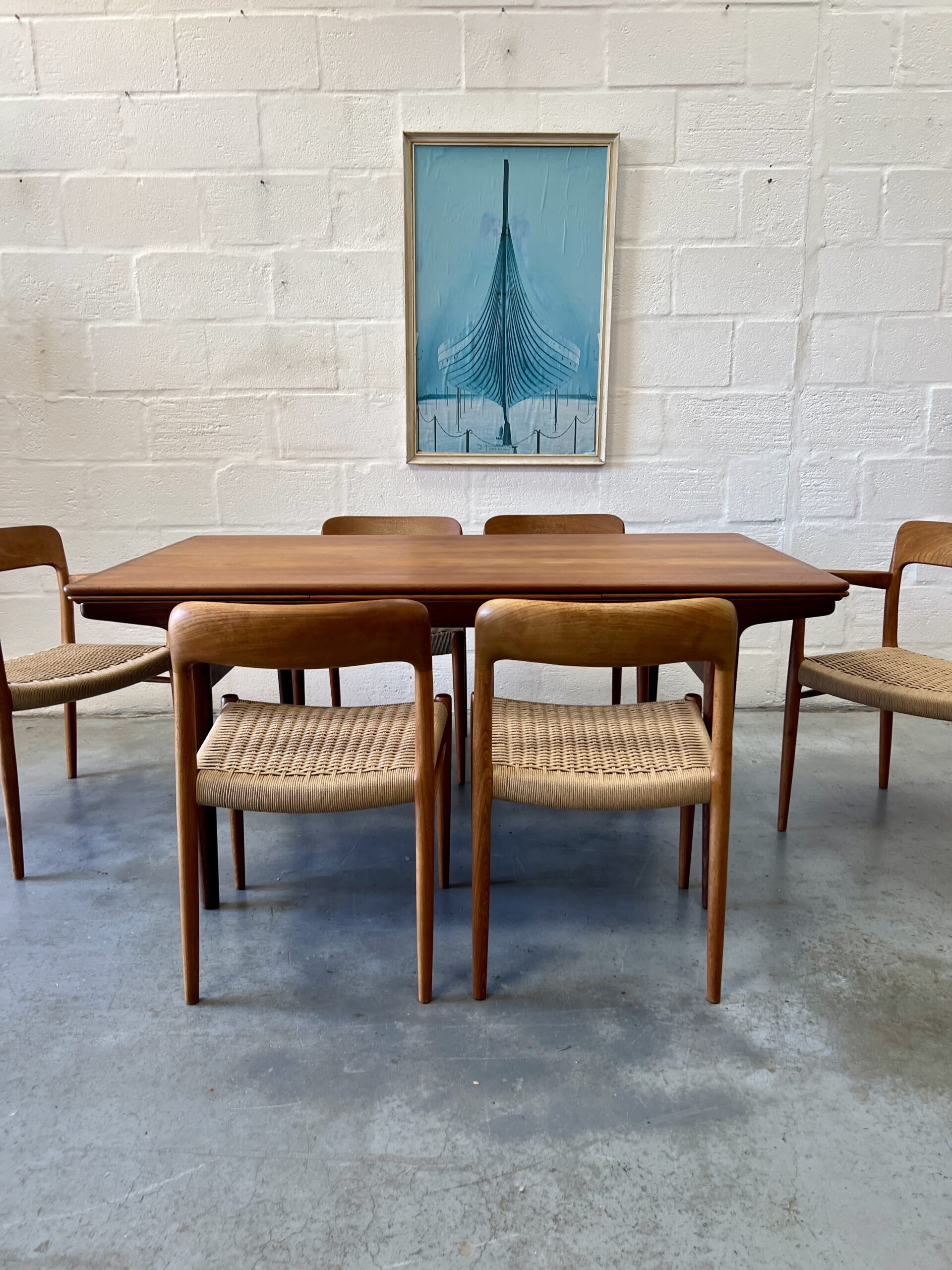 Johannes Andersen collaborated with the Danish furniture manufacturer Uldum Møbelfabrik, which was known for producing mid-century modern furniture, primarily in the 1960s. Andersen designed a variety of pieces for the company, including dining chairs, sideboards, and tables, often using woods like teak and rosewood. The collaboration resulted in a line of well-crafted, Scandinavian modern furniture that is now sought after by collectors.