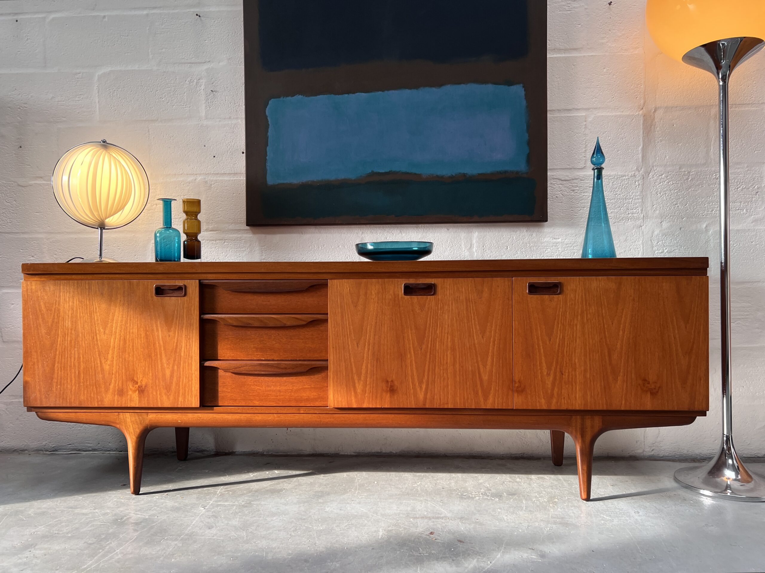 This elegant mid century sideboard was crafted by Greaves & Thomas, renowned for creating high-end designer furniture for the British market. The sideboard features three drawers, with the top drawer including a felt-lined cutlery divider. To the right, a double cupboard serves as a drinks cabinet, with a drop-front door and a black formica-lined surface for servicing bottles and glasses. On the left, there’s a single cupboard space, offering ample storage.