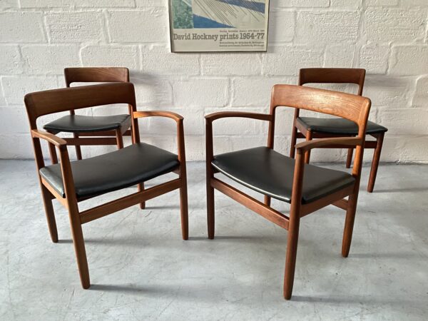 A beautiful unrestored extending teak dining room ‘Fonseca’ table and four chairs designed by John Herbert for Younger. Highly influenced by Scandinavian design the set includes two carver chairs and 2 dining chairs. These are finished in original black vinyl.