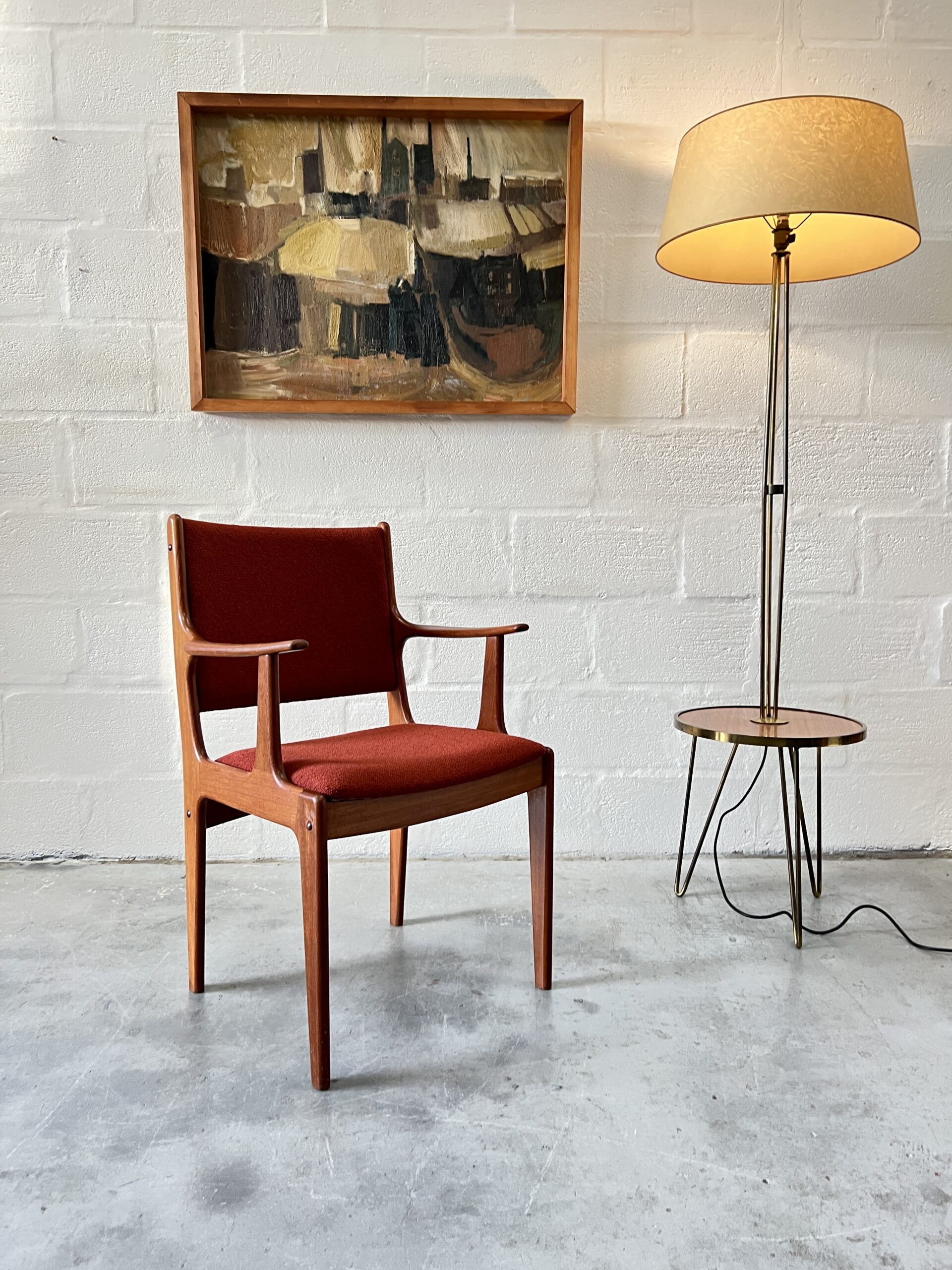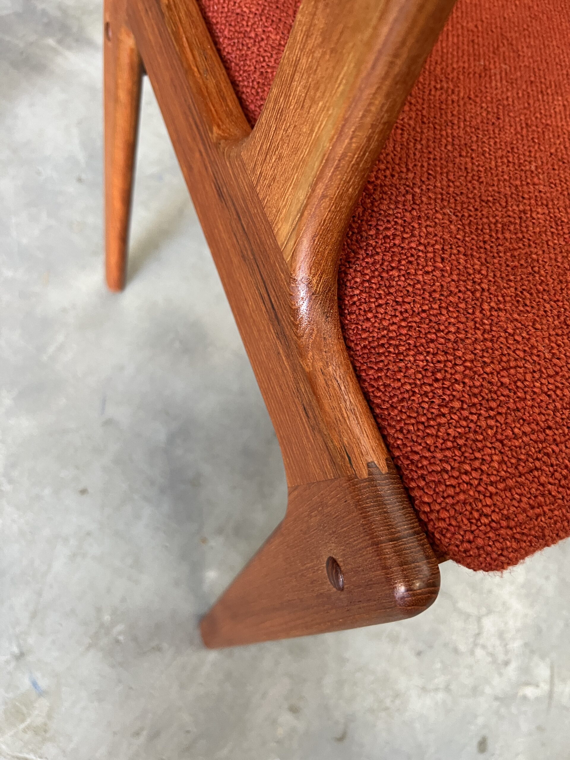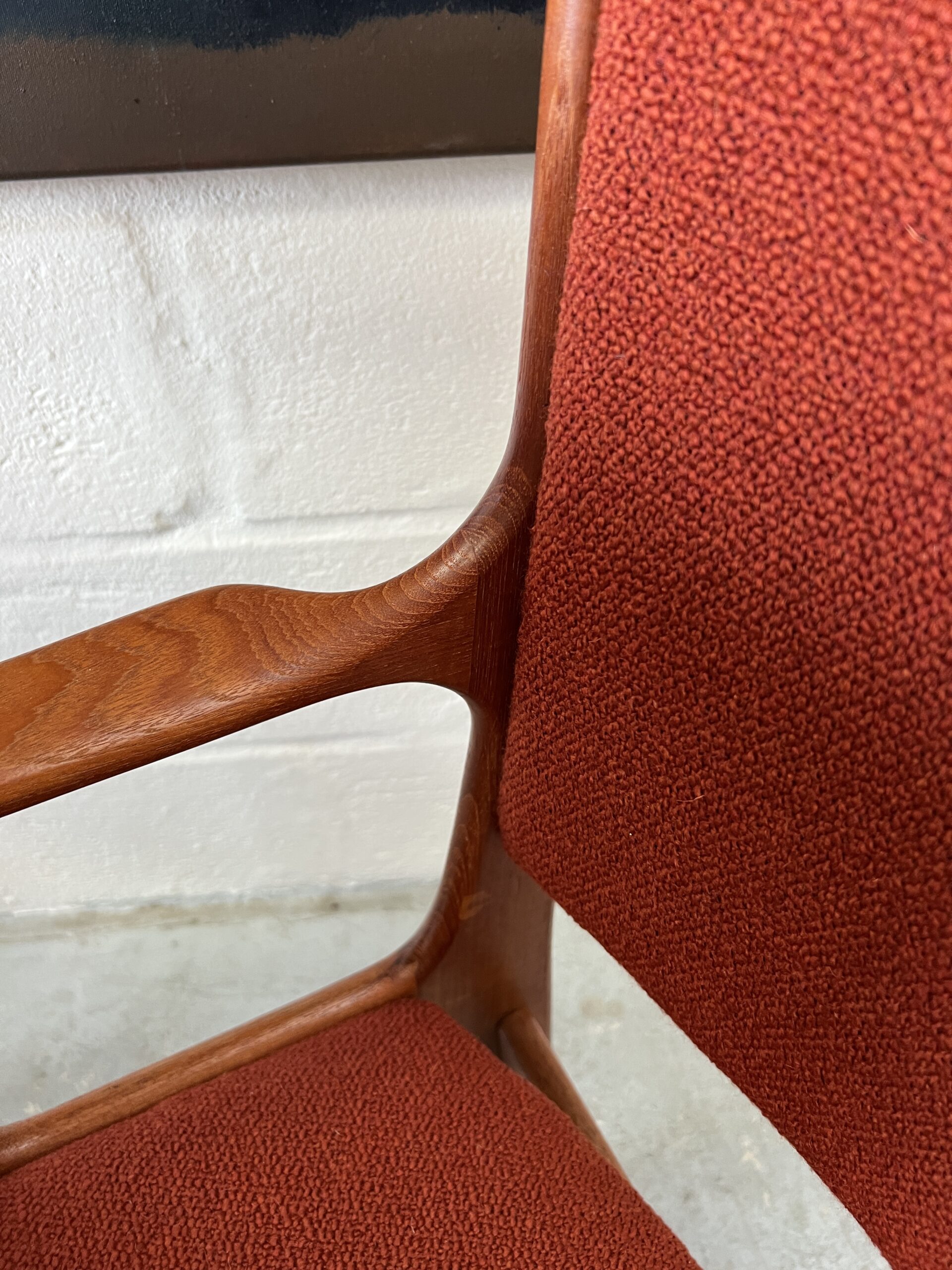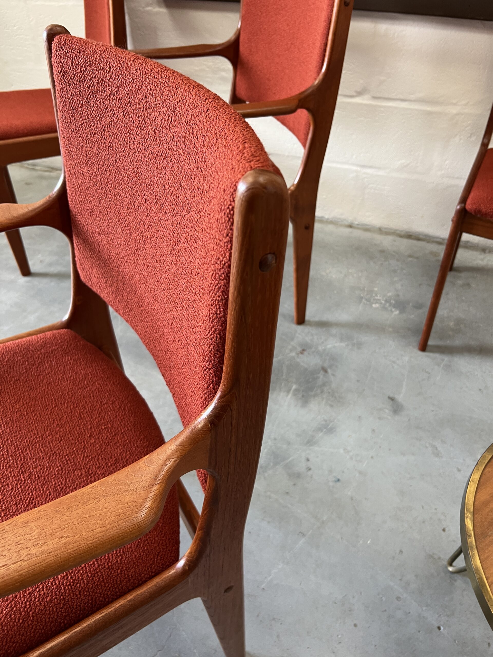 Stylish and supportive set of vintage dining chairs with high back teak frames and red wool nylon mix boucle fabric upholstered seat and high back. Designed by Johannes Andersen and produced in 1968 by Uldum Mobelfabrik. The set consists of 2 side chairs and 2 carver chairs.
