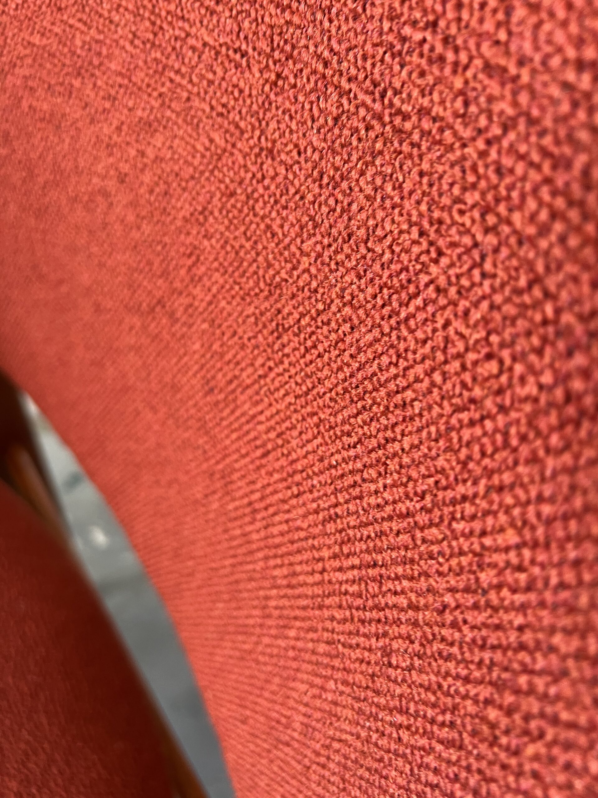 The teak frames are elegantly curved with soft edges. Very good solid frames with beautiful patina. In good vintage condition, newly re-upholstered. Some minimal signs of previous use. Please review the photos – happy to answer any questions.