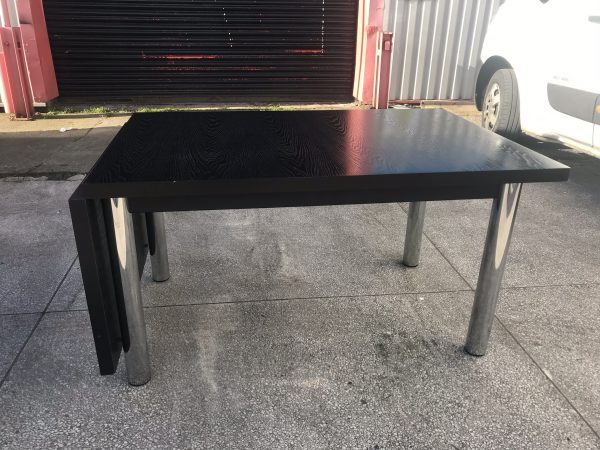 The table is wood effect laminate, with chromed removable legs and a single drop-leaf.