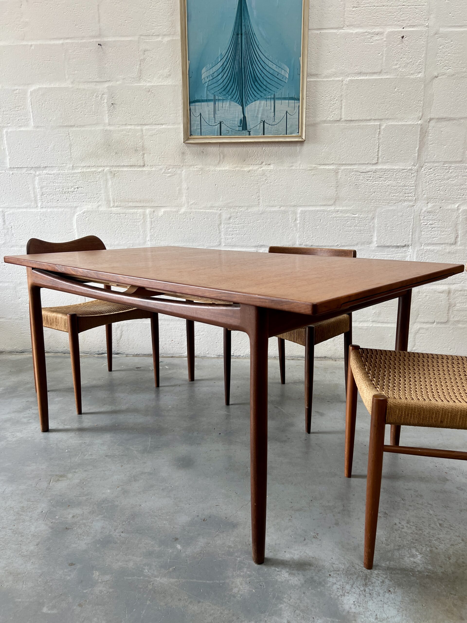This I.B. Kofod Larsen Danish Design G Plan Dining Table is a beautiful addition to any dining room. The rectangular shape and teak material give it a unique vintage feel, perfect for those who love mid-20th century furniture. This original dining set was manufactured in the UK in 1960, providing seating for up to six people. This was designed by I.B. Kofod Larsen for their up-market ‘Danish Line’ range in c1962, and made until c 1967. The leaves store neatly under the table when not in use. One of the leaves of the table has the G Plan Danish stamp.