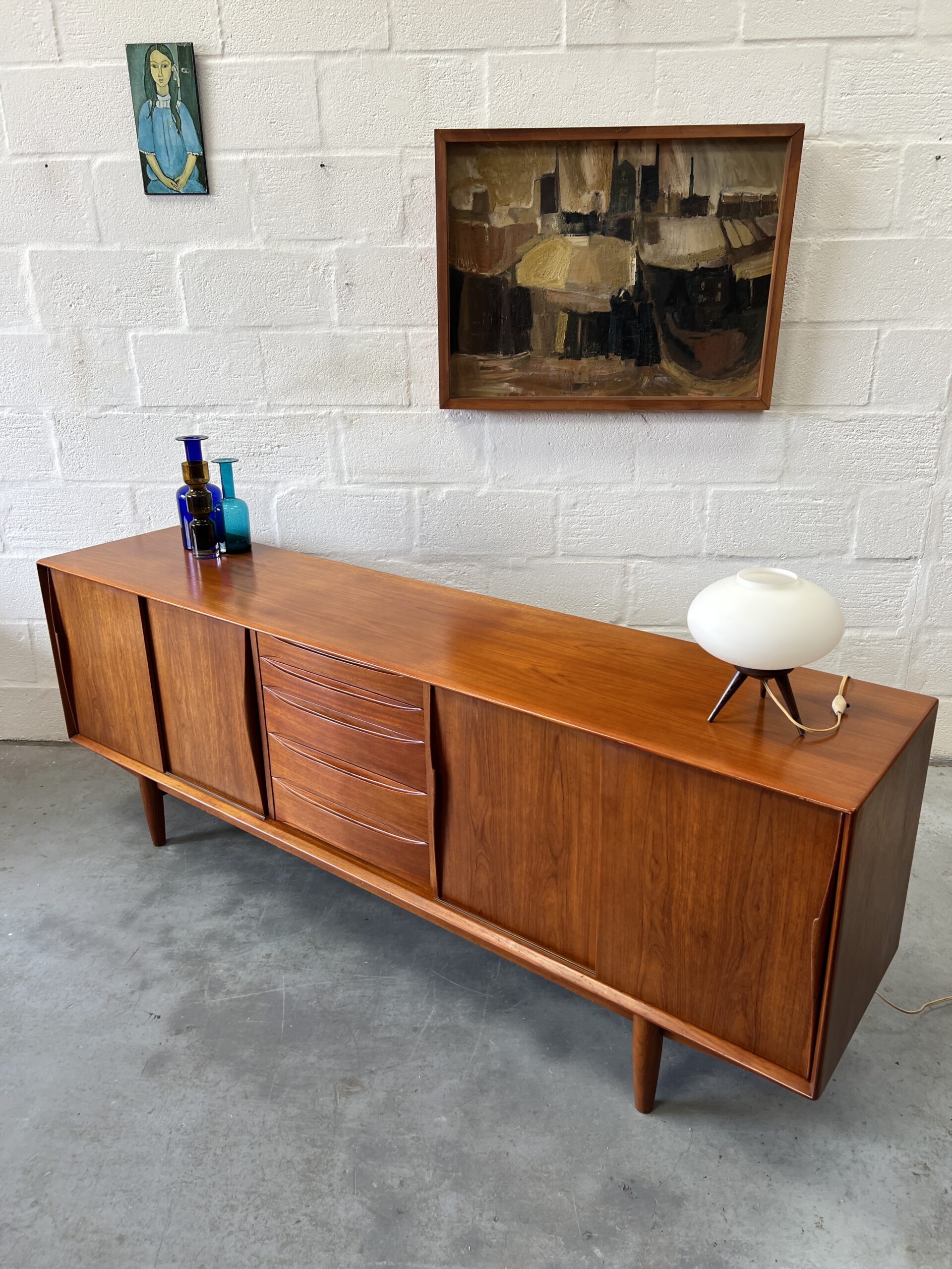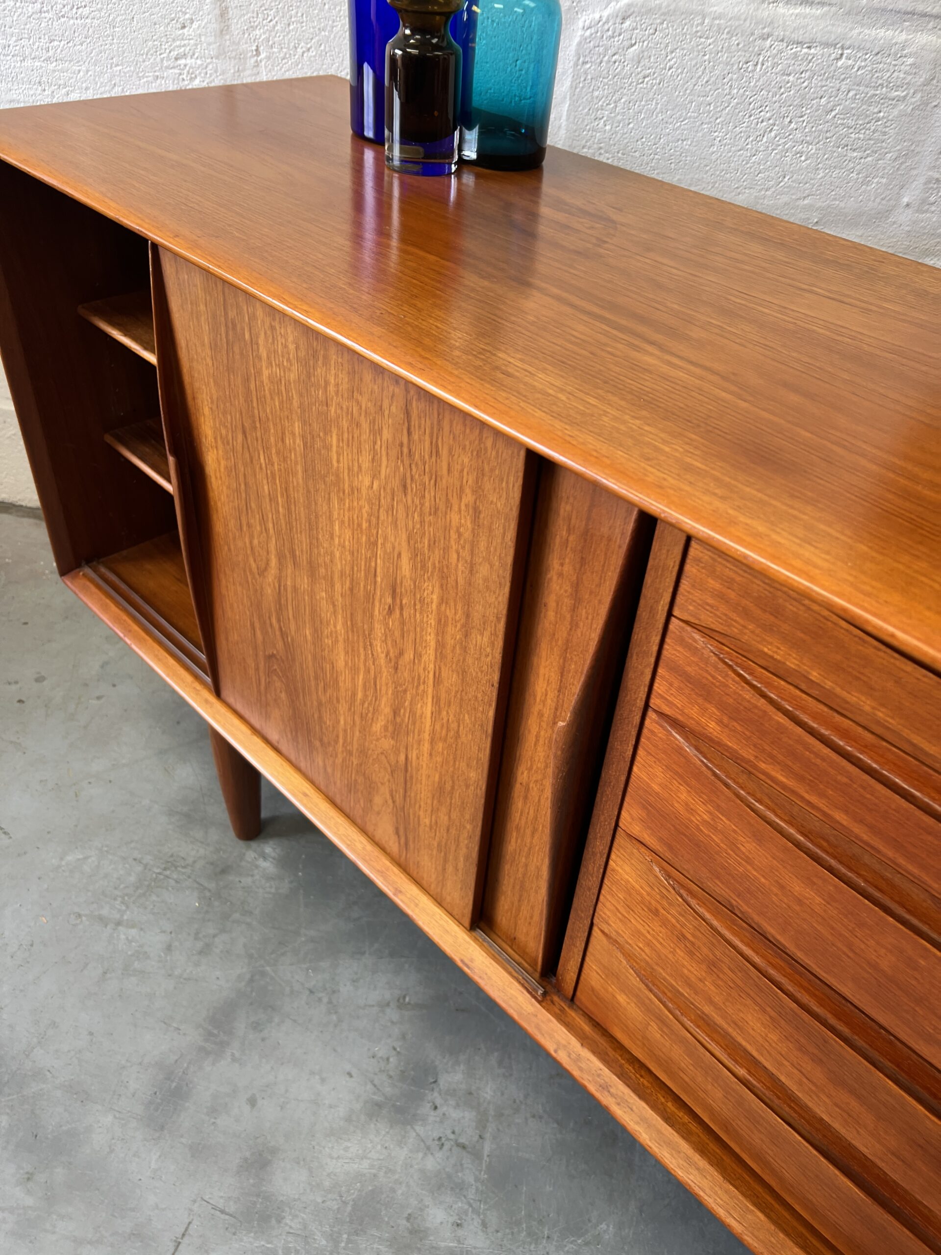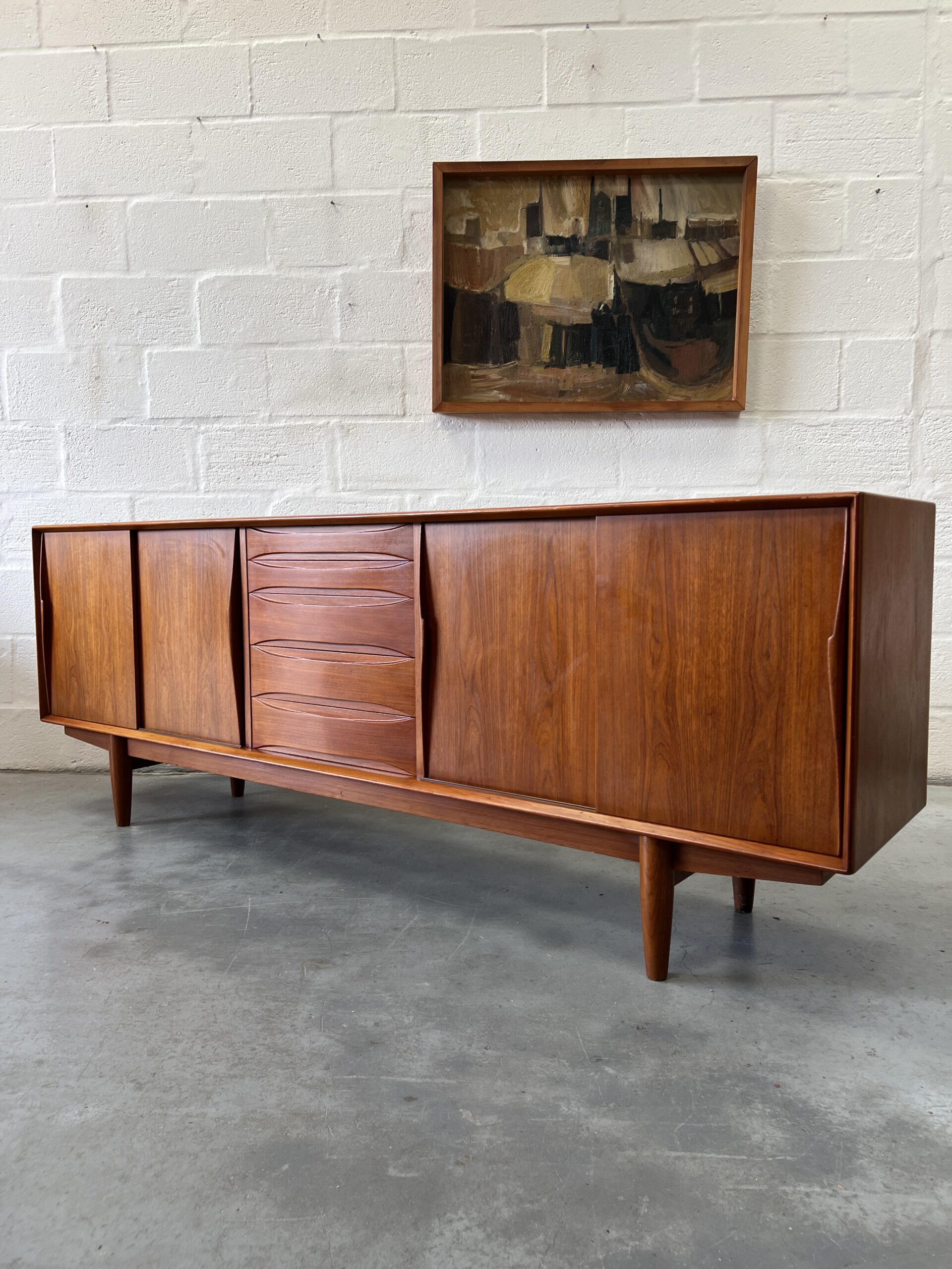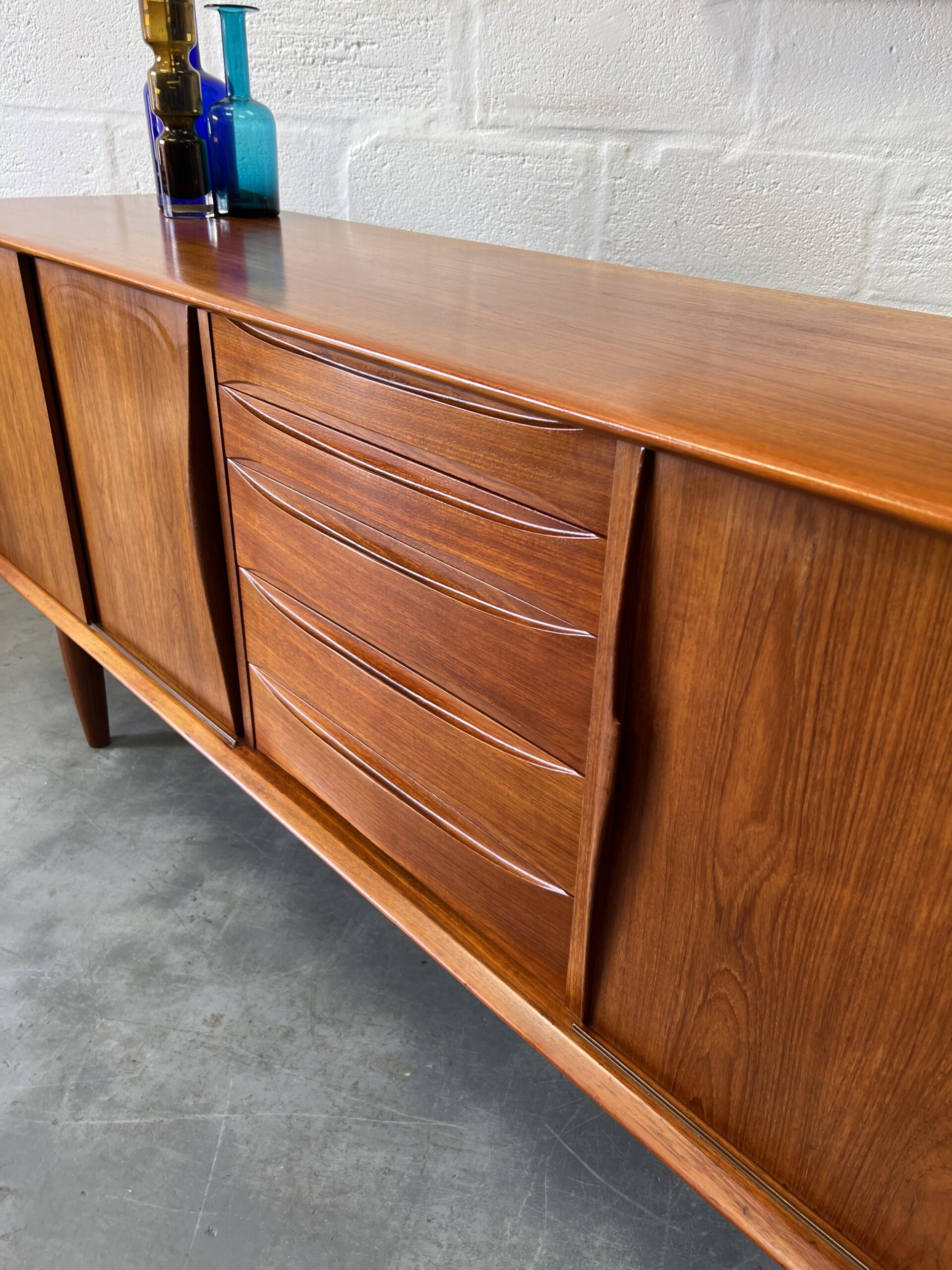 This stunning long, sleek sideboard features gorgeous details like the elegant, sculptural hand-carved door handles and drawer fronts. This gorgeous piece is usually attributed to Danish designer Arne Vodder, but we believe it is simply inspired by his Treiannale series.