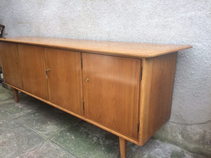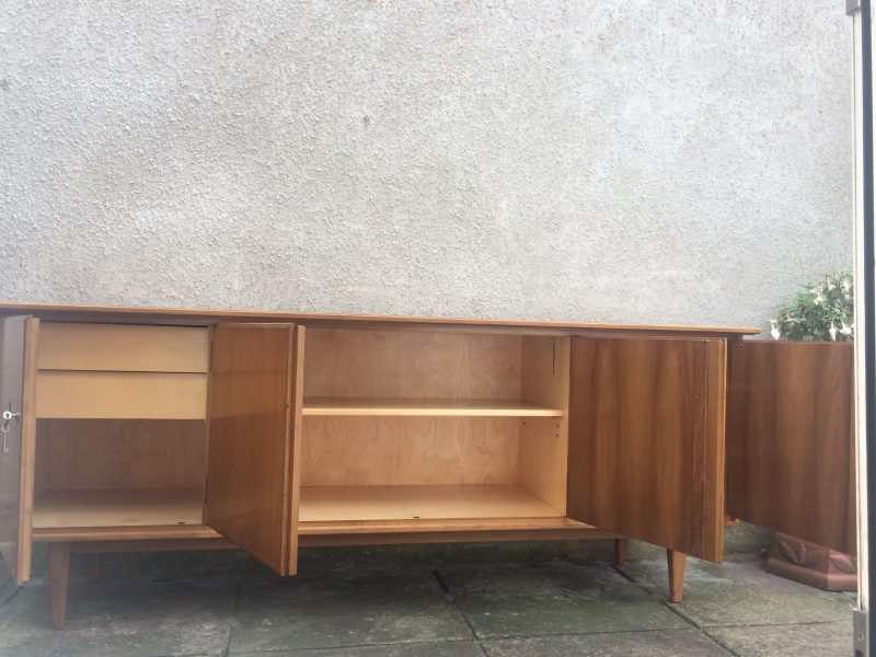 Lovely splayed legs and a unique contrast of wood within the cupboards (see photos). Internal ‘waterfall’ drawers in one cupboard.
