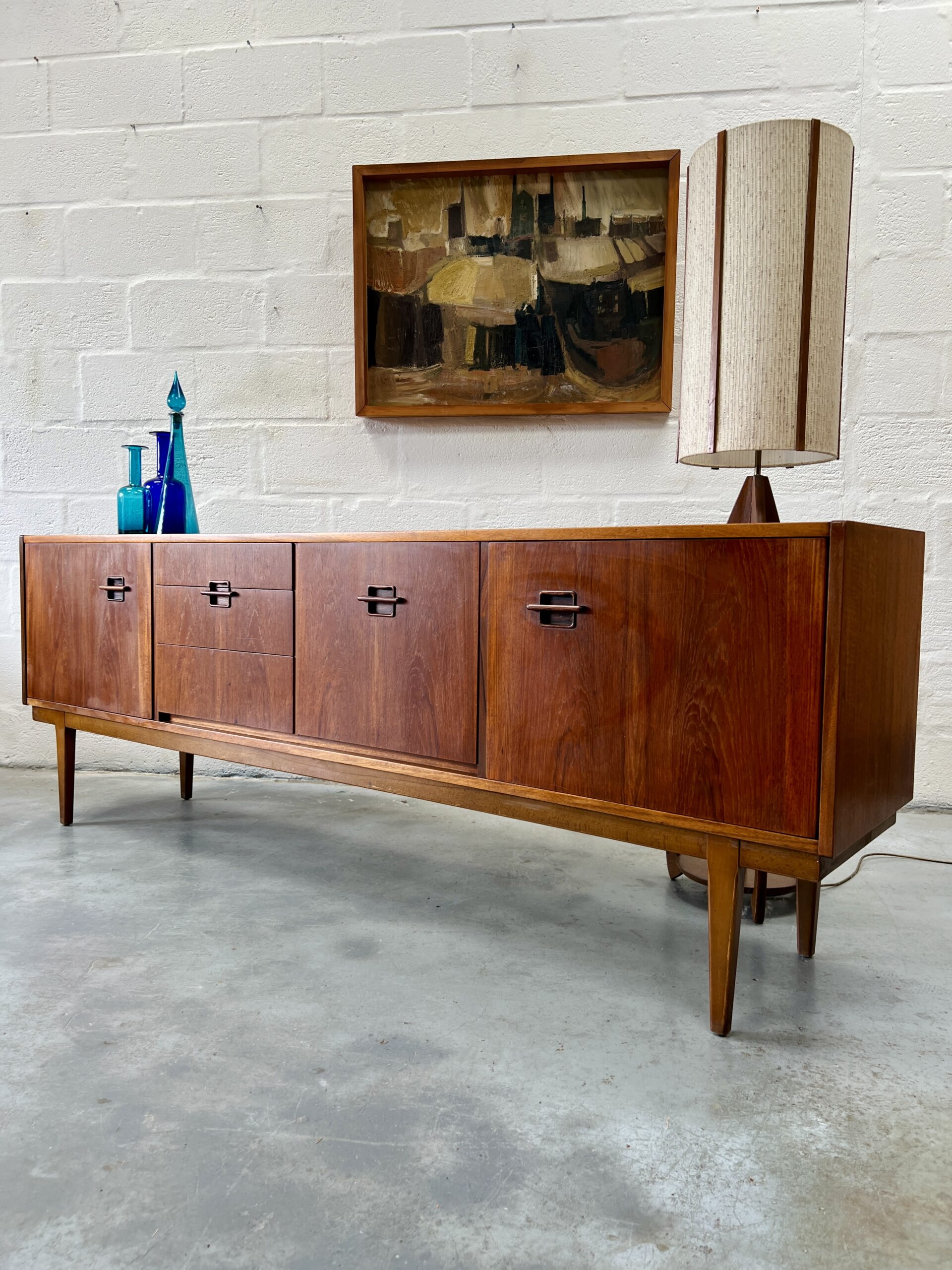 A classic mid century sideboard with a very unusual set of rosewood handles by British Mid Century Manufacturer Nathan Furniture.