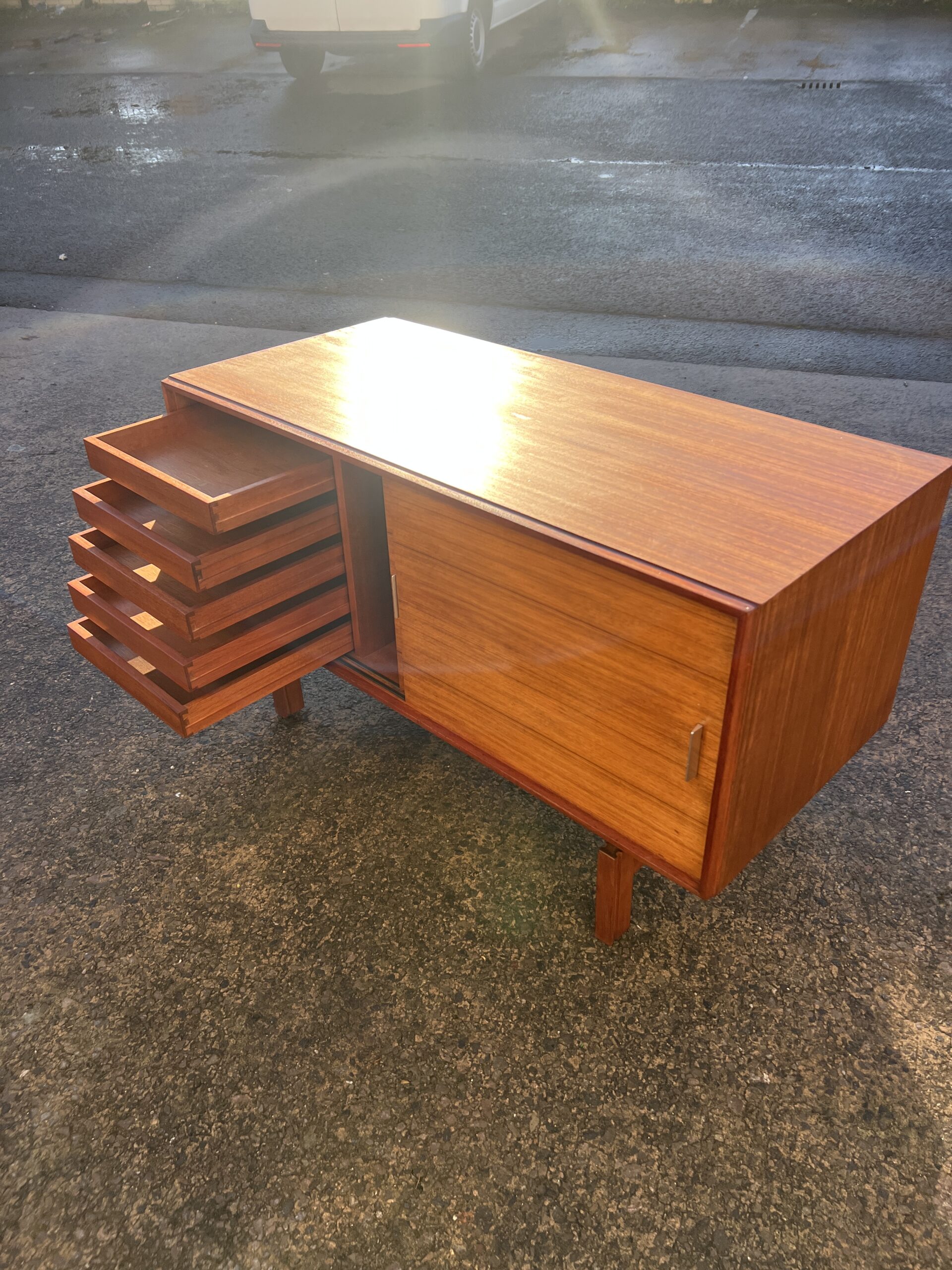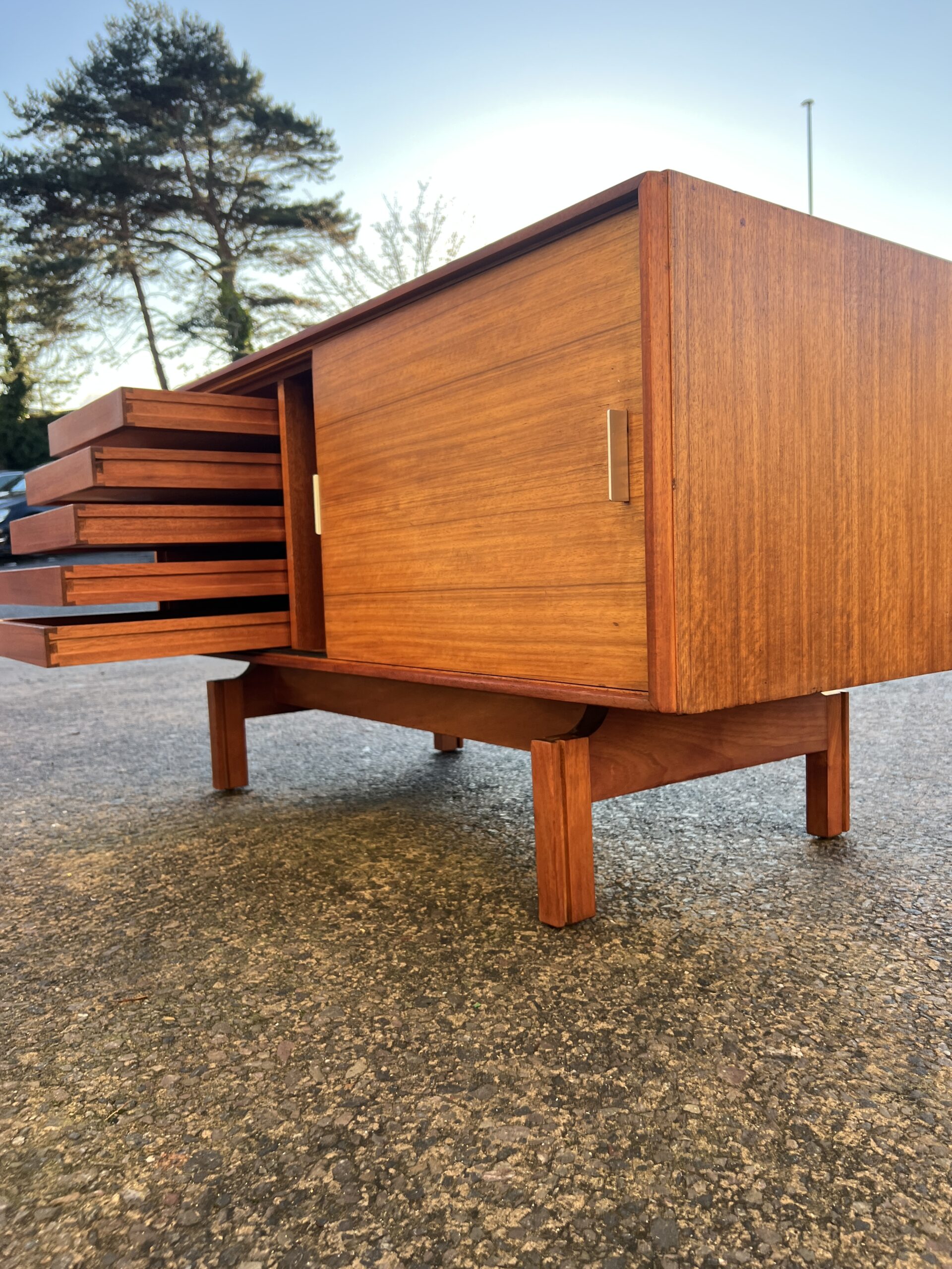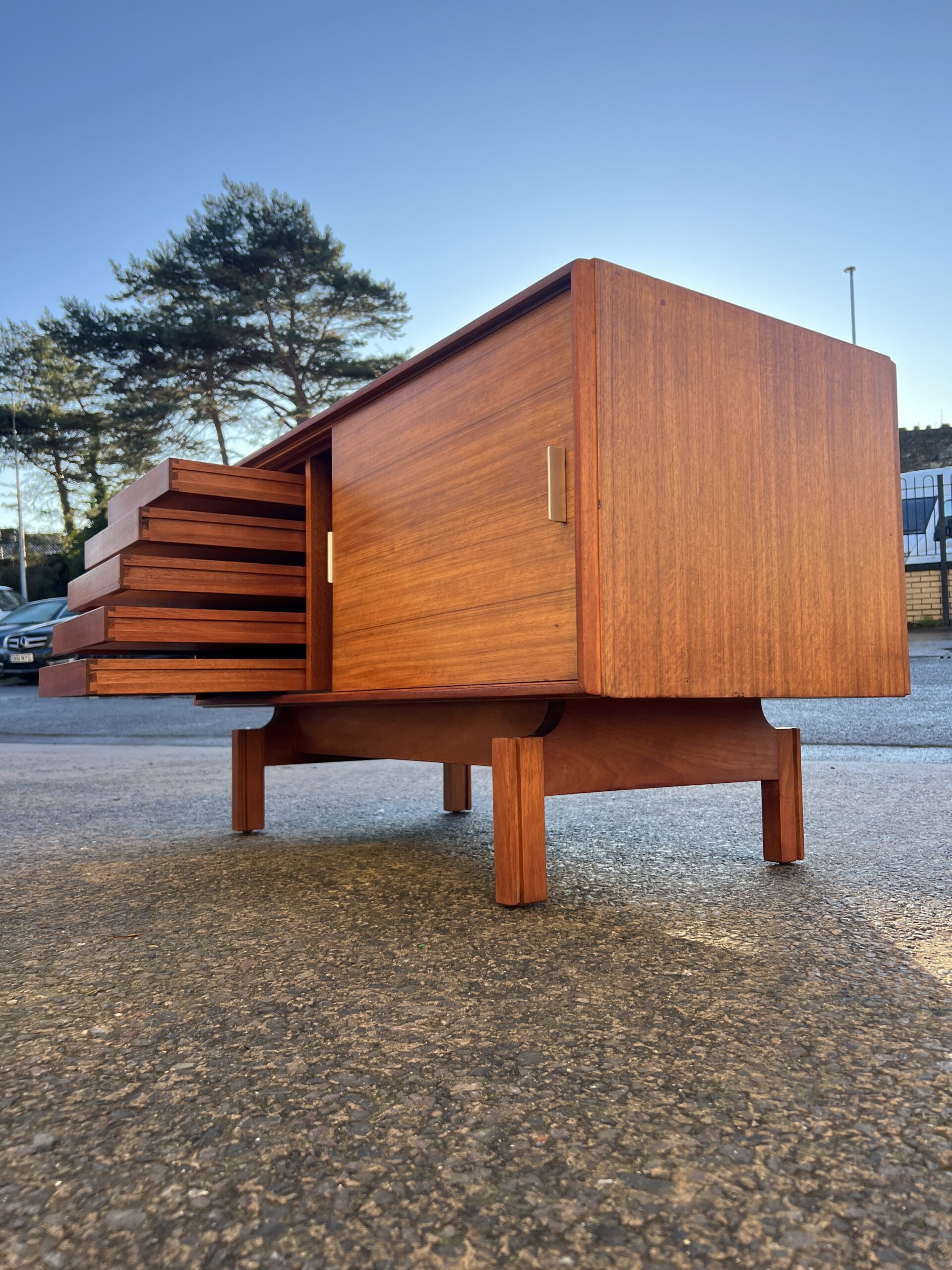The sideboard is finished all round so could be used as a room divider, it has two sliding doors with sculpted aluminium handles, behind the doors there are five slim drawers to the left and a shelf to the right, each drawer is stamped with the maker’s label.