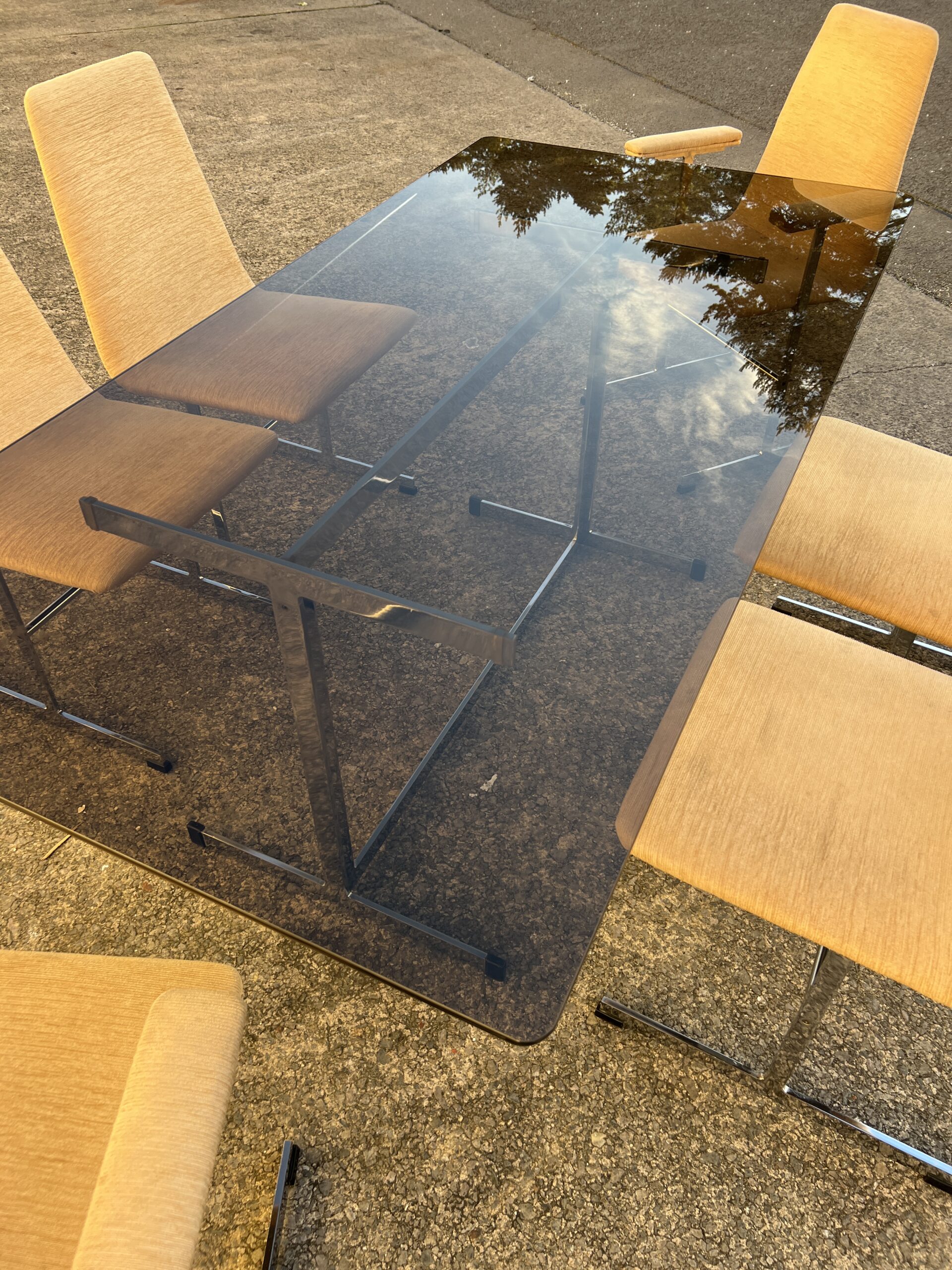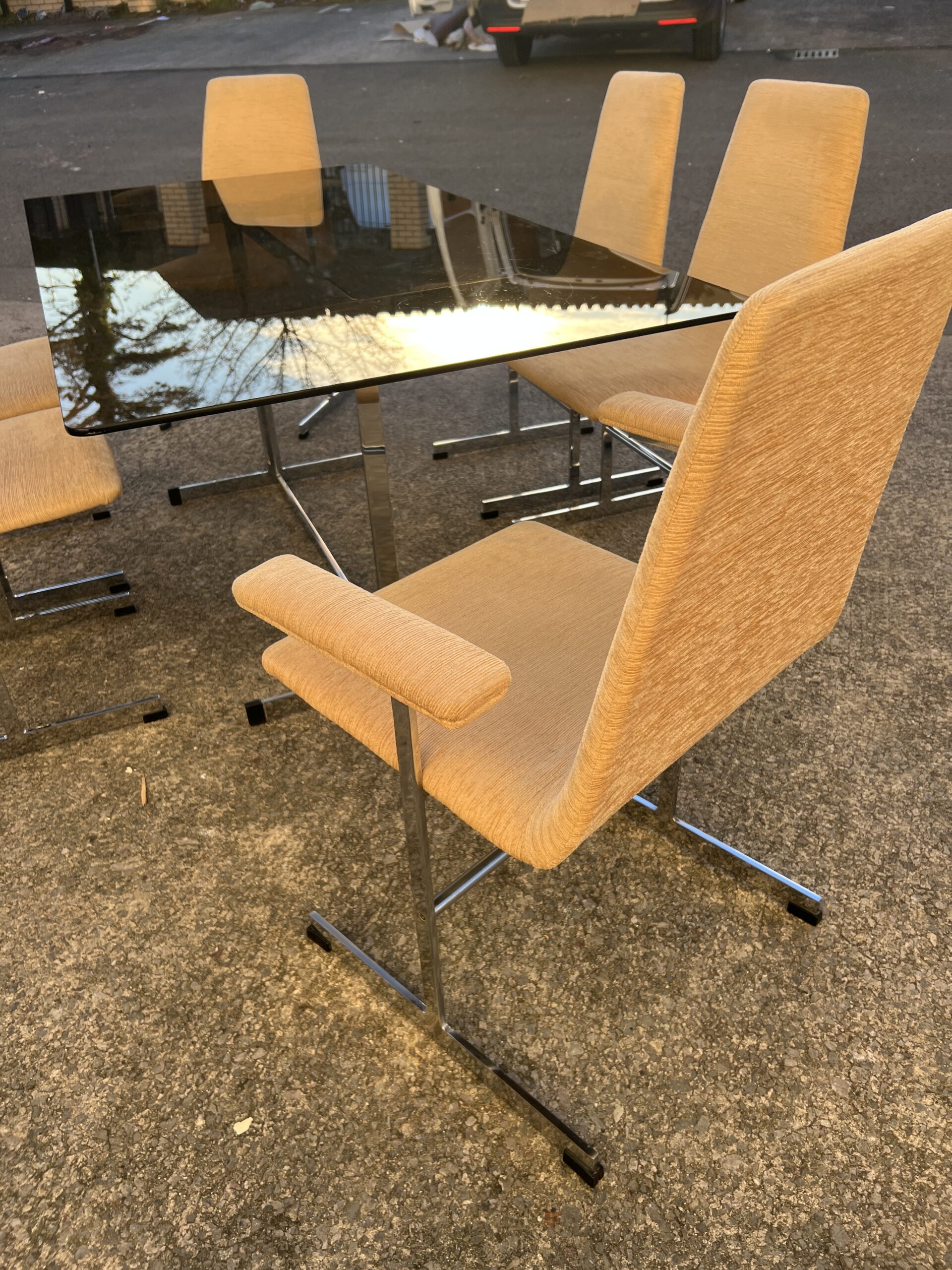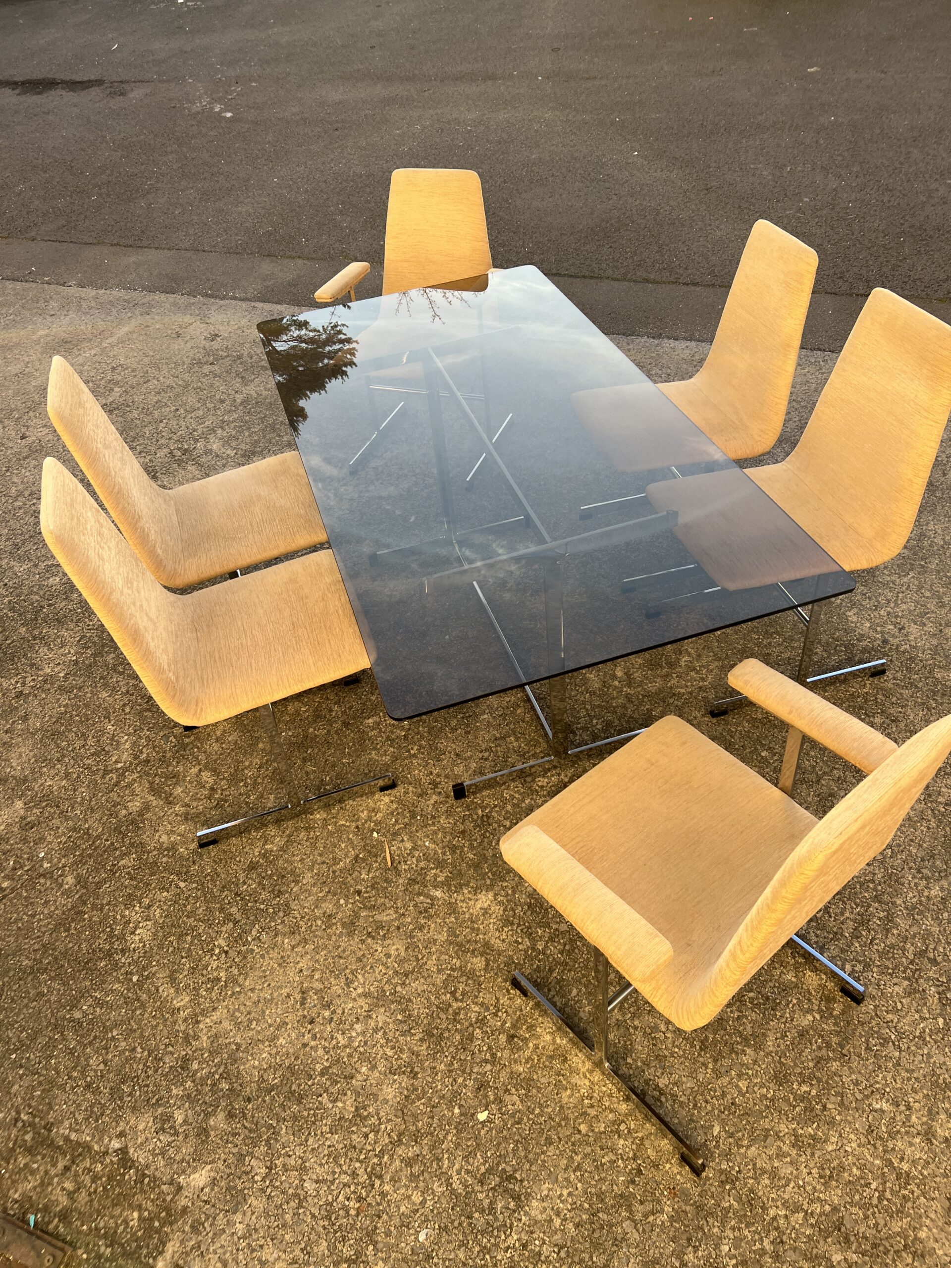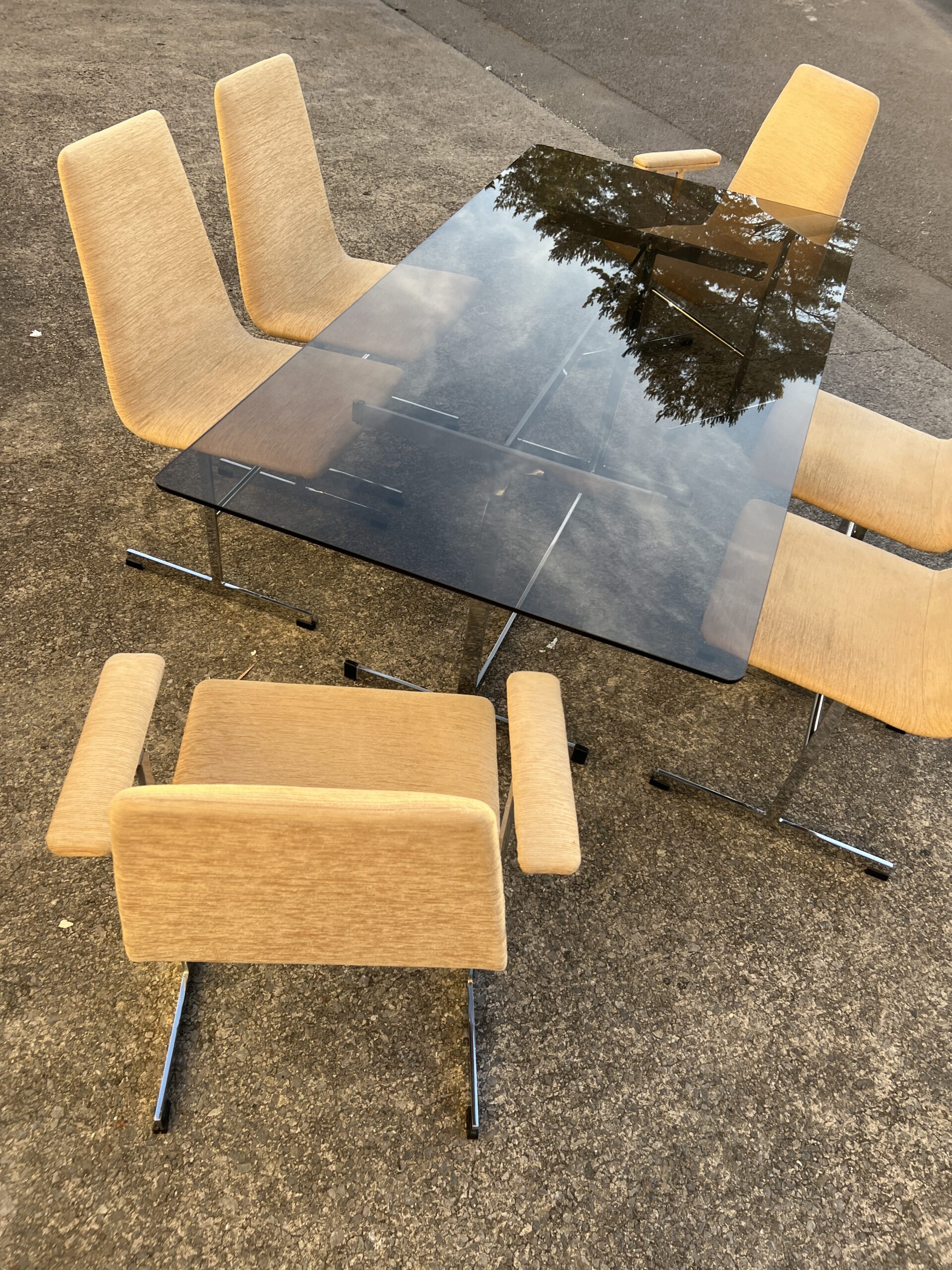 A 1970s Pieff dining room table and six chairs. The ‘Lisse’ range suite comprising of a smoked glass table top on a chrome base and a matching set of six highback chairs including a pair of armchairs.