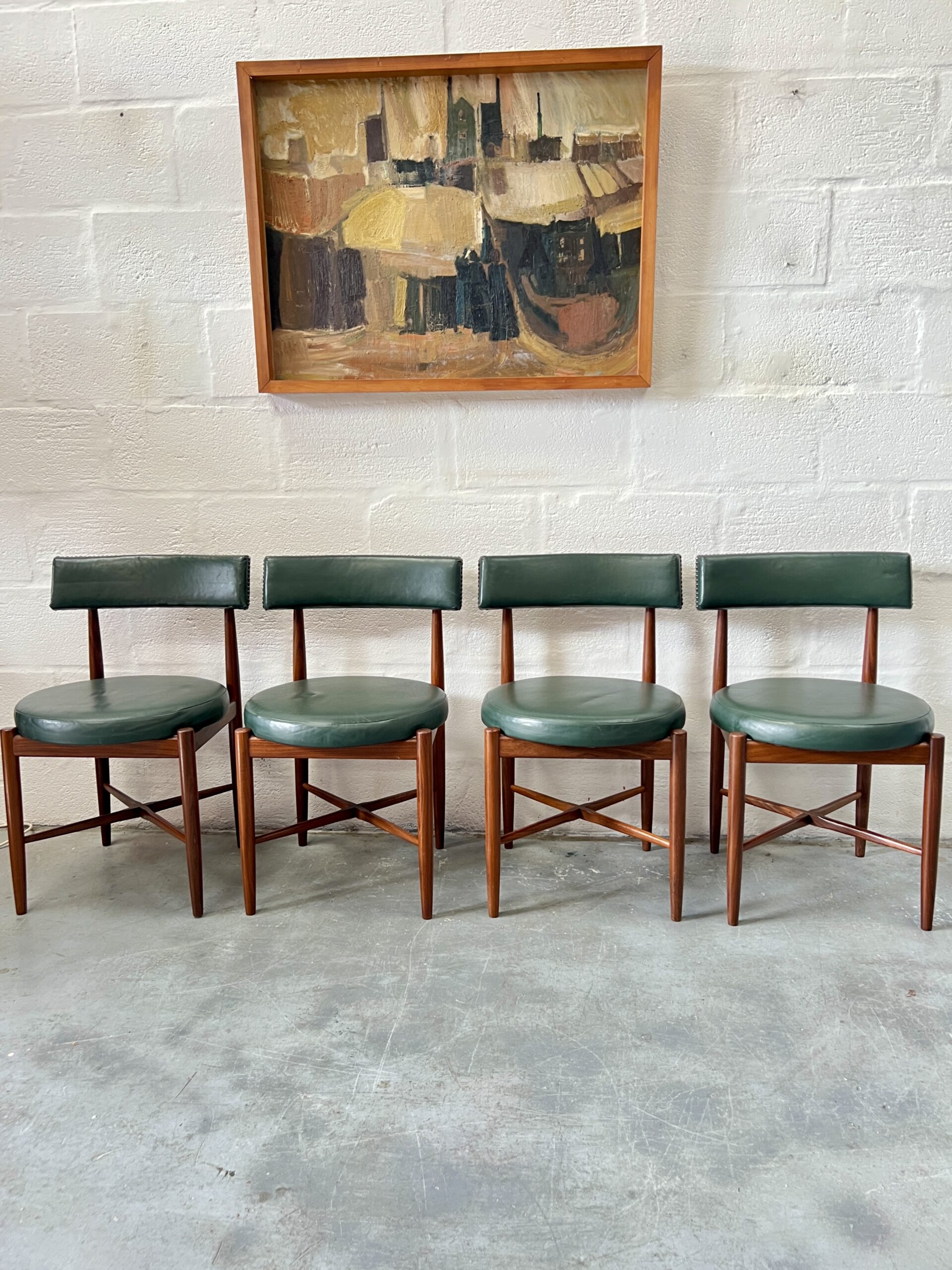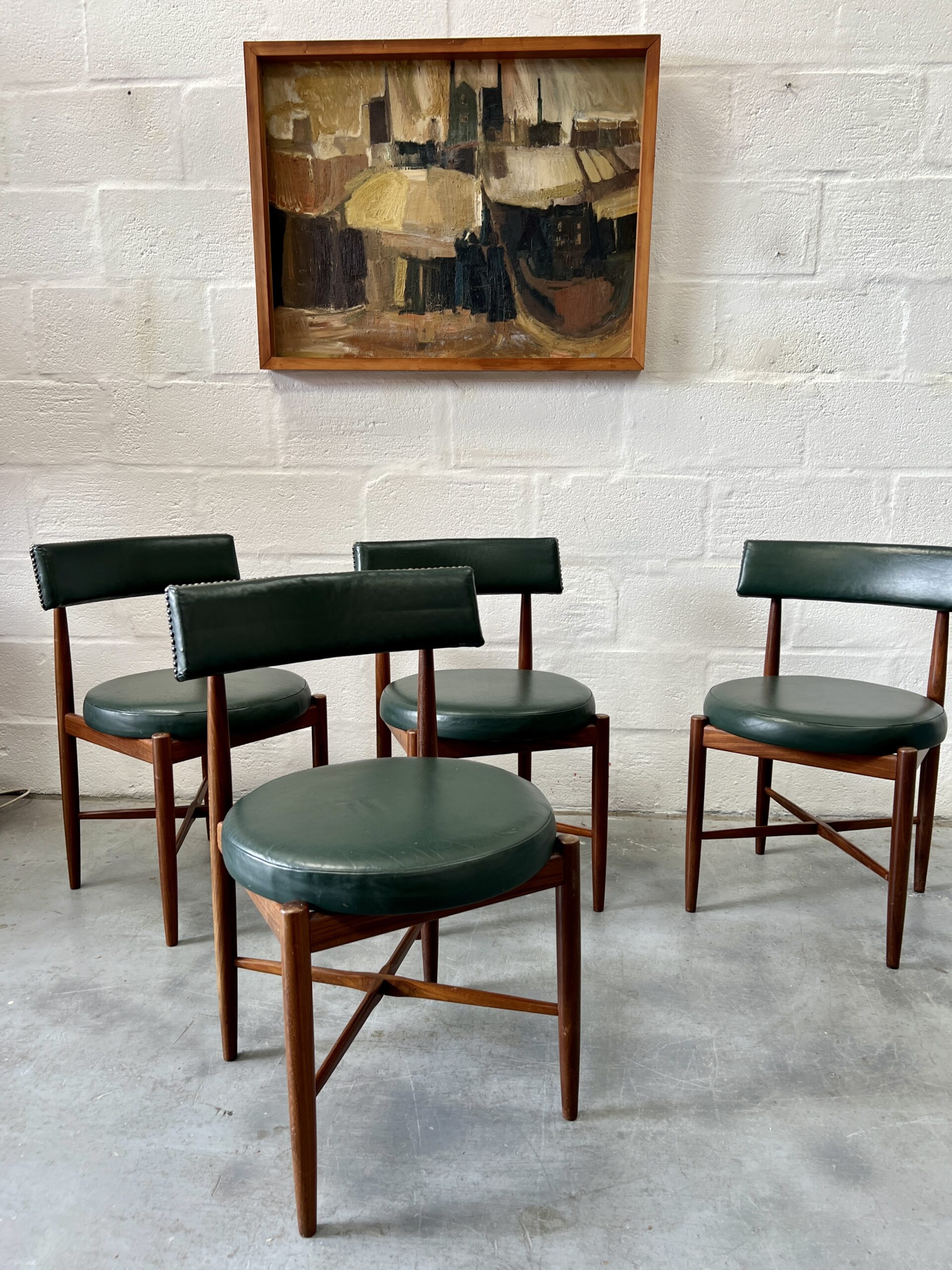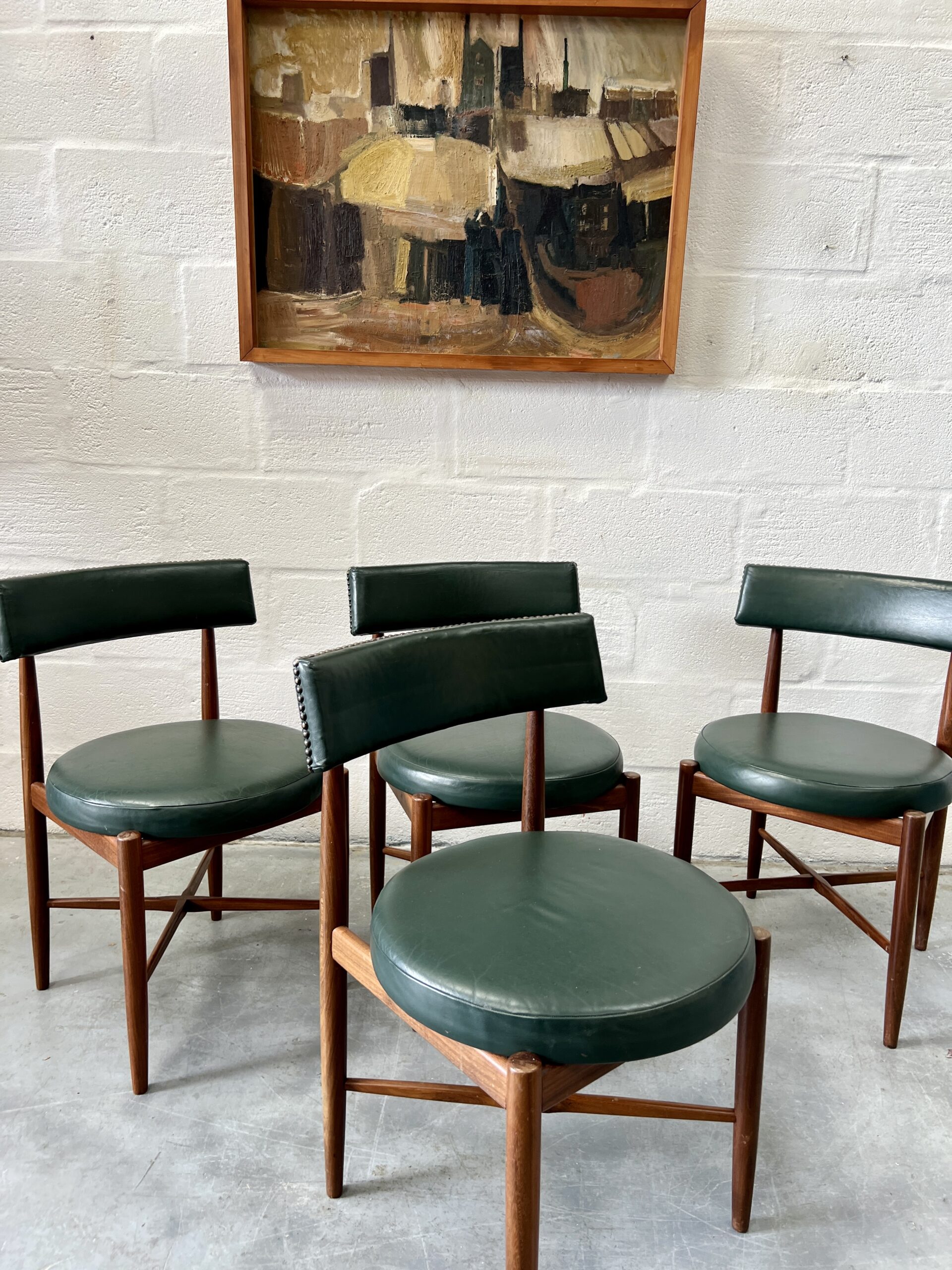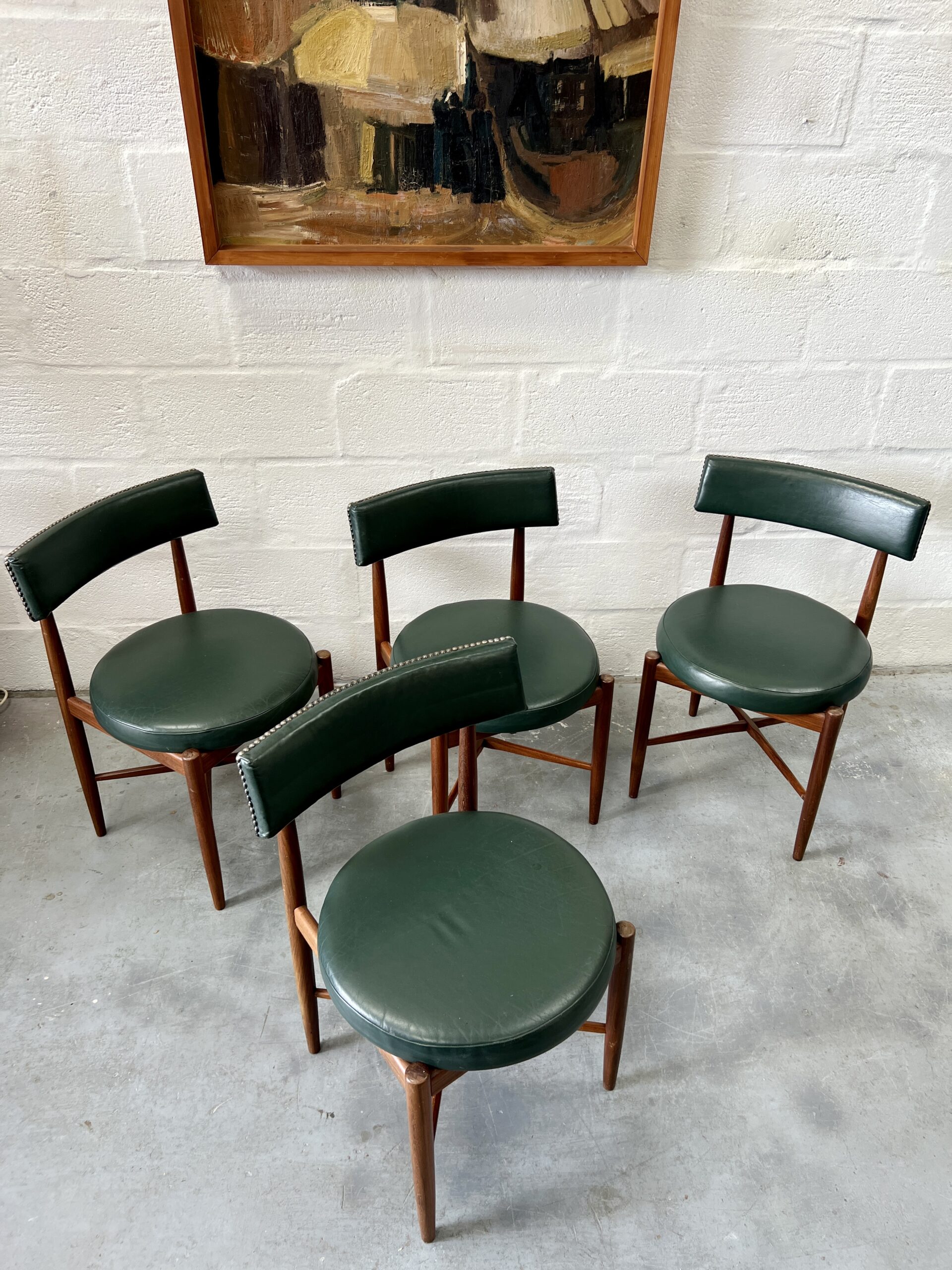 4 matching G Plan Fresco dining chairs, teak frames with dark green leather upholstered seats.