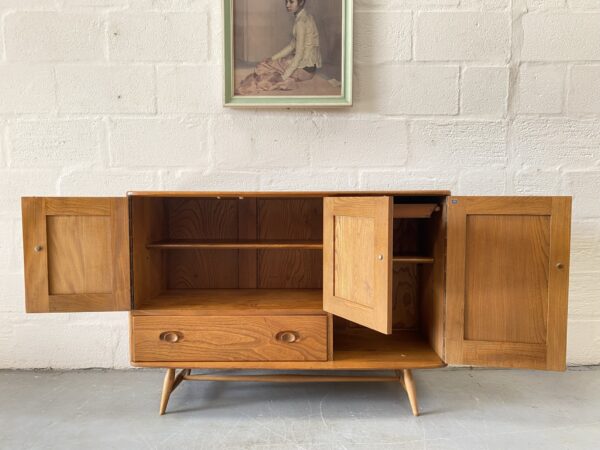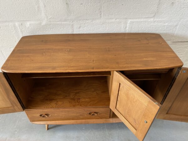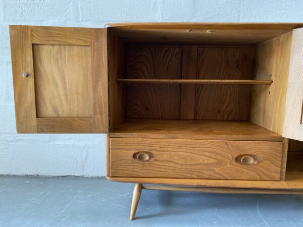 This early design from the Windsor Contemporary Range, dating to 1956, has the classic elm top which has come to be expected from any Ercol Windsor piece.