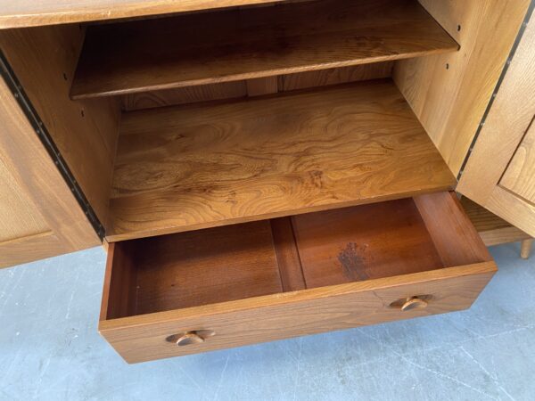 A double door cupboard over one drawer, next to a single cupboard with the original cutlery tray inside. Adjustable / removable shelves within the cupboards.