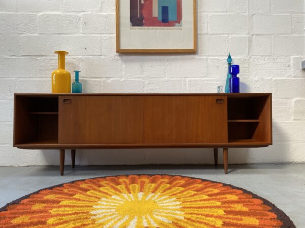 A stunning piece of Danish mid century design. Featuring a minimalistic modern design with scooped solid teak handles, sliding doors and solid teak turned legs.
